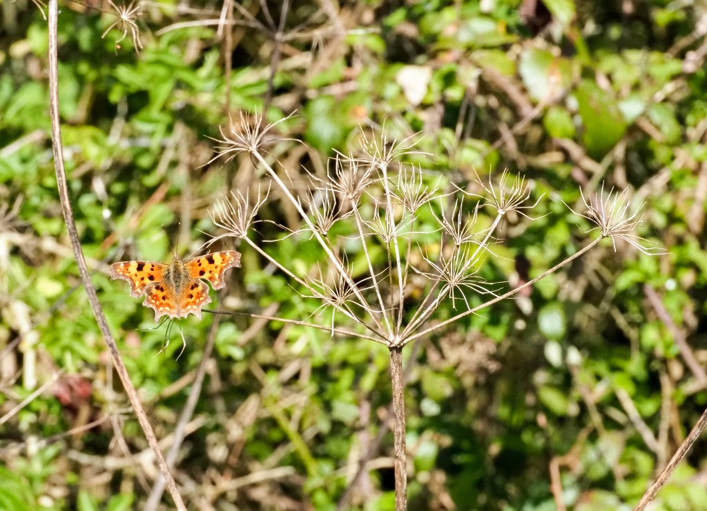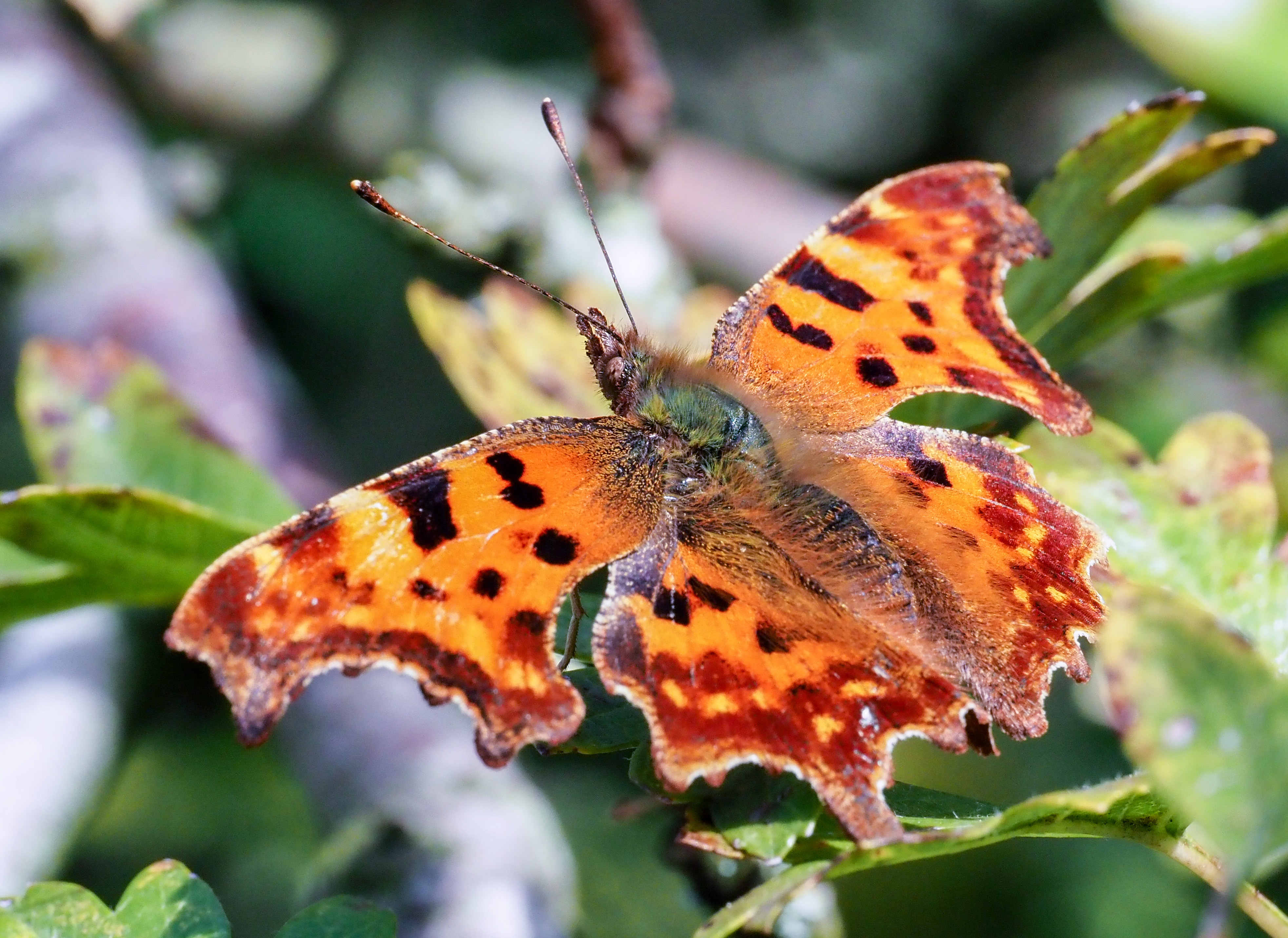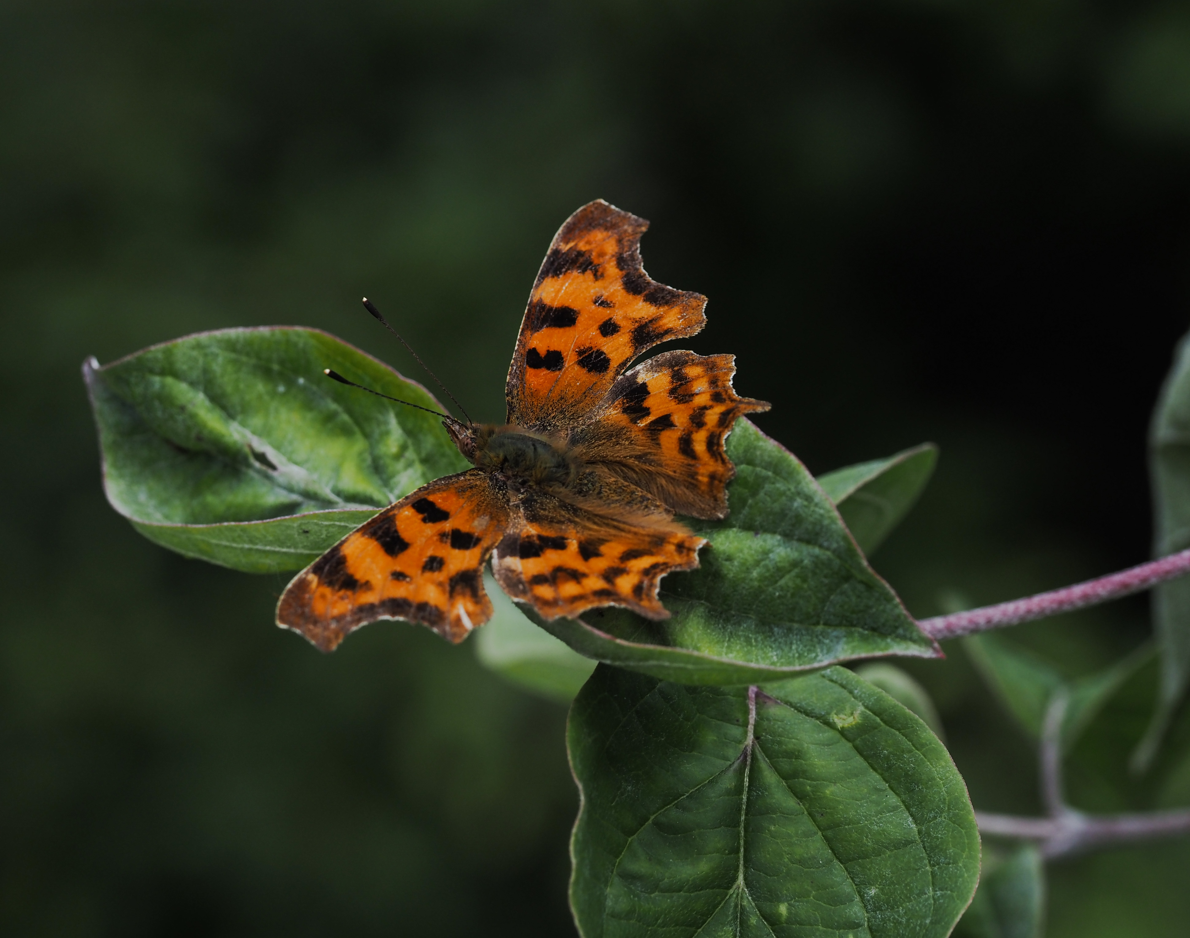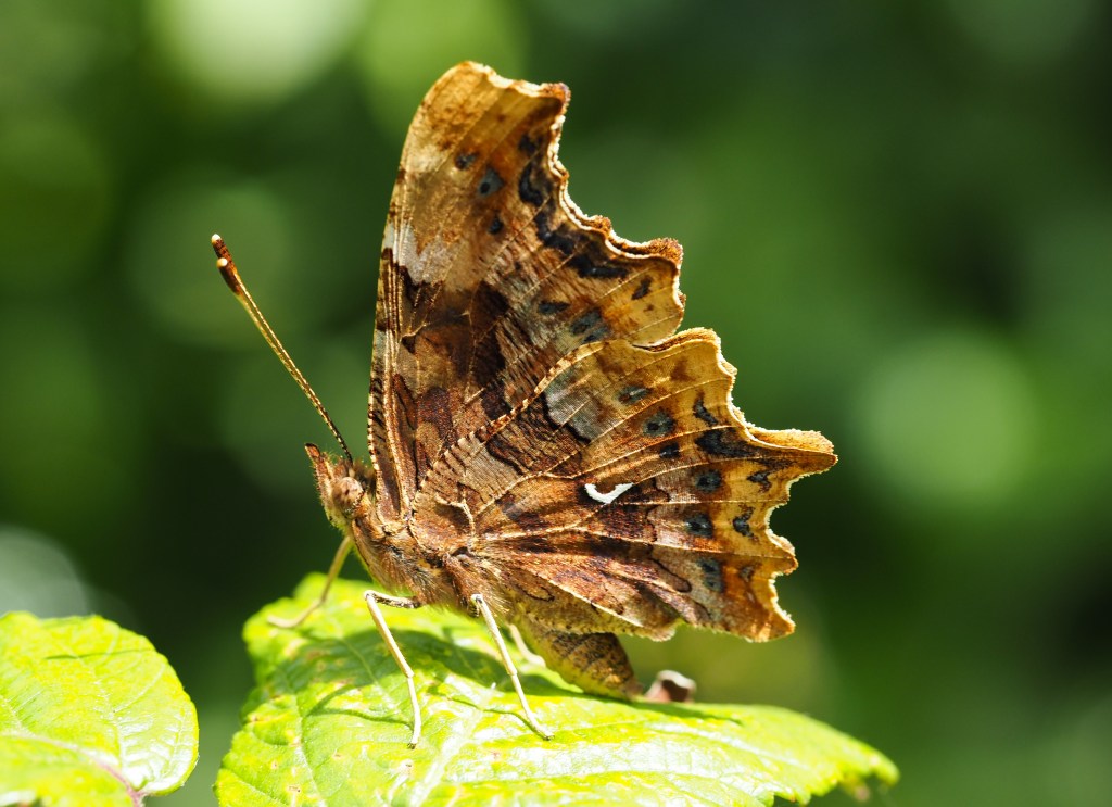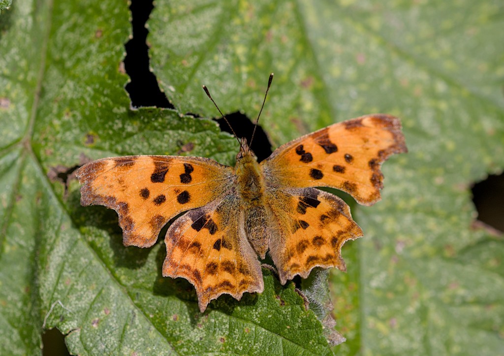 Comma butterflies are thought to be leaf-mimics, using the jagged, brown outlines of the undersides of their closed wings to appear like shriveled, dried leaves when at rest. This undoubtedly works well during its winter hibernation, but they can look very prominent to when standing on bright green leaves (below).