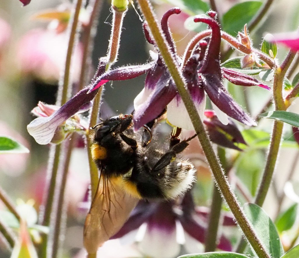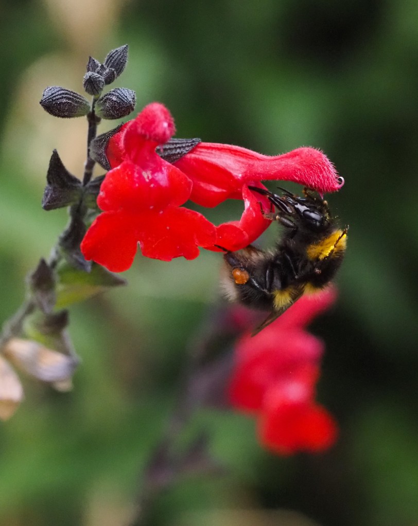 I have also referred to bumblebee tongue lengths in at least three other blogs: Bumblebees and flower tubes: a tale of two honeysuckles, Two ways to suck a Salvia! Nectar robbing bumblebees, and Red hot lips and bumblebees. It is a sort of leitmotif, or recurrent theme, in my interactions with insects, as these photographs show.